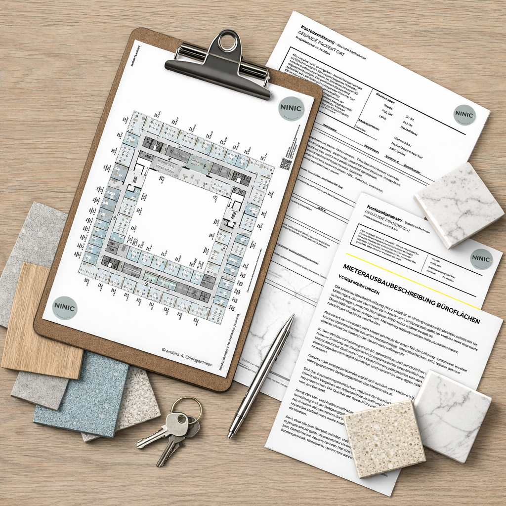 Ihr erhaltet professionell aufbereitete Unterlagen, die den Mieterausbau transparent, vergleichbar und entscheidungsreif machen. Rot-Gelb-Planungen, Grobkostenschätzungen, Mieterbaubeschreibungen und Materialisierungslisten übersetzen Planung in verständliche Inhalte, klar strukturiert und visuell nachvollziehbar.