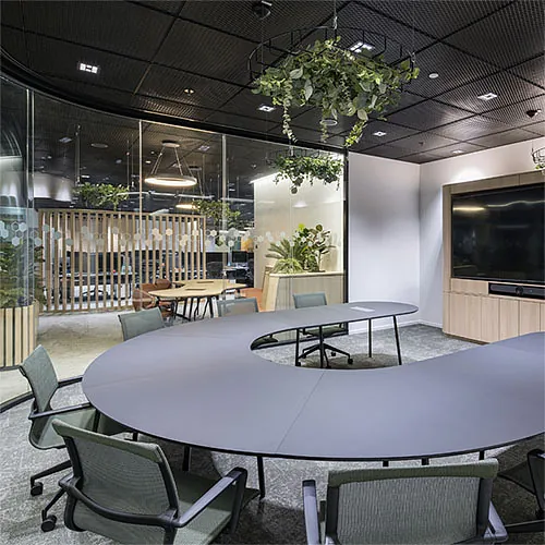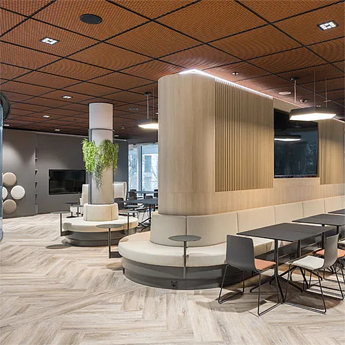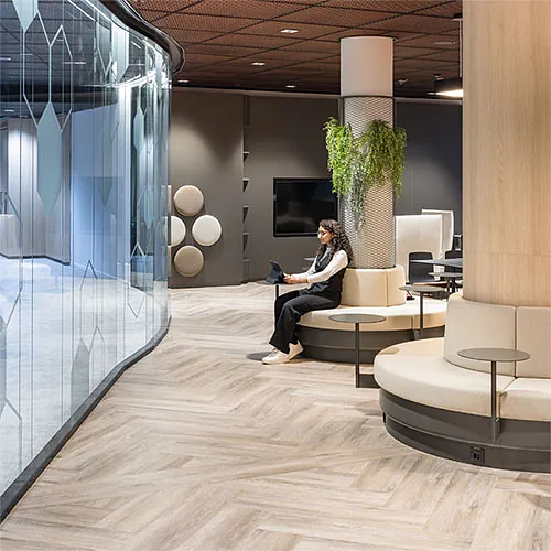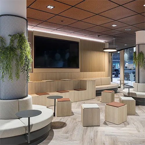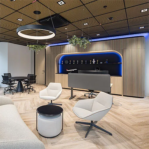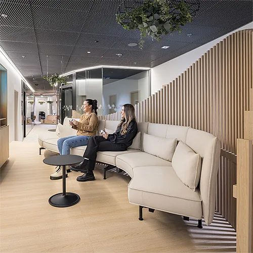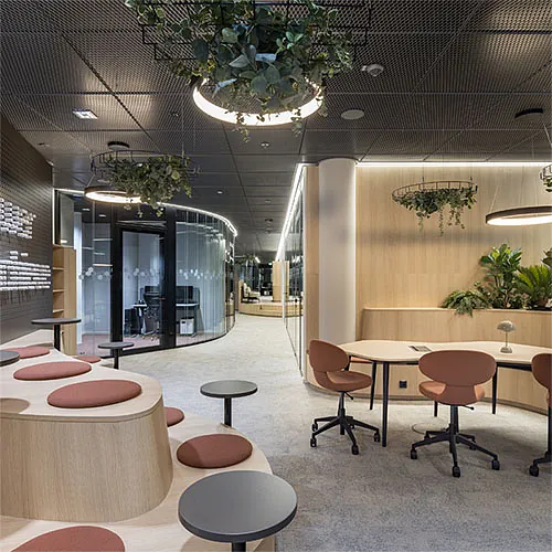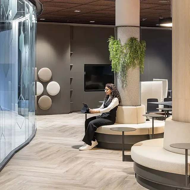 Möbel und Ausstattung schaffen Ergonomie, Flexibilität und spiegeln die Identität des Unternehmens wider.